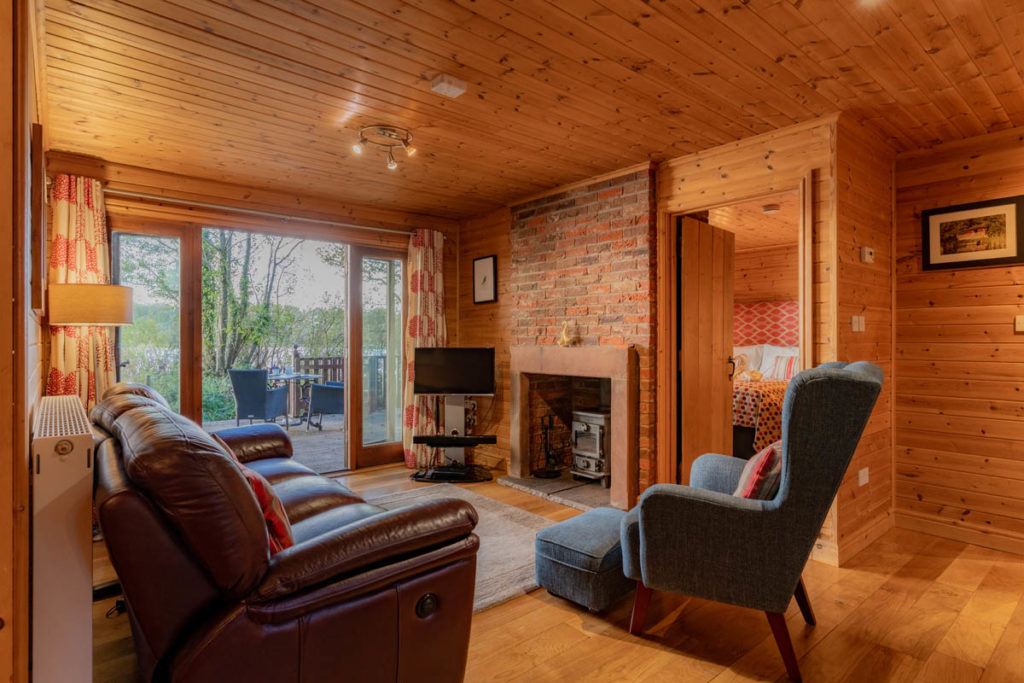 Fieldfare Lodge Picture Gallery, shows the cosy living area, hot tub and lake view. Find out if Fieldfare Luxury Lodge is for you! Book Here.